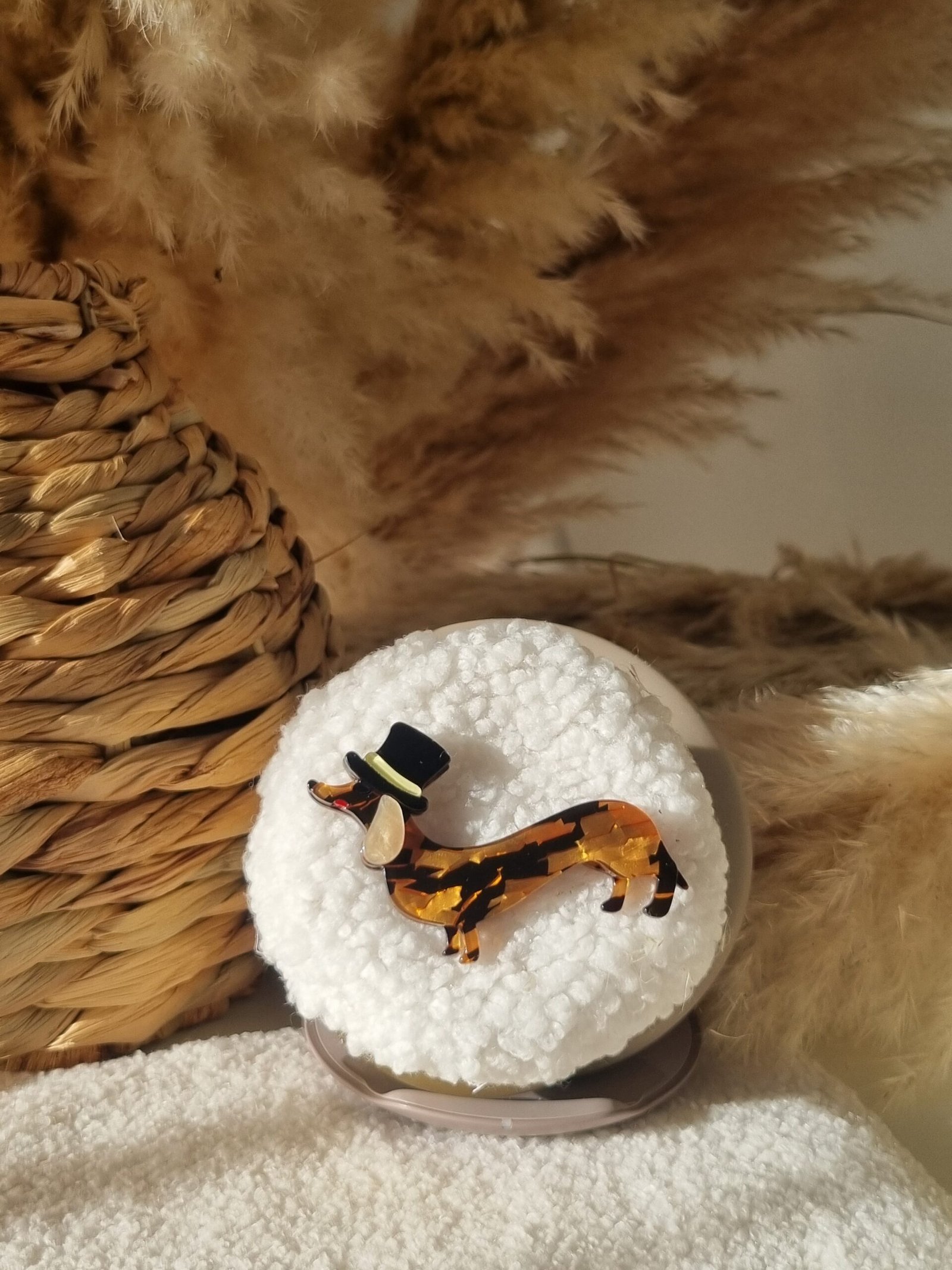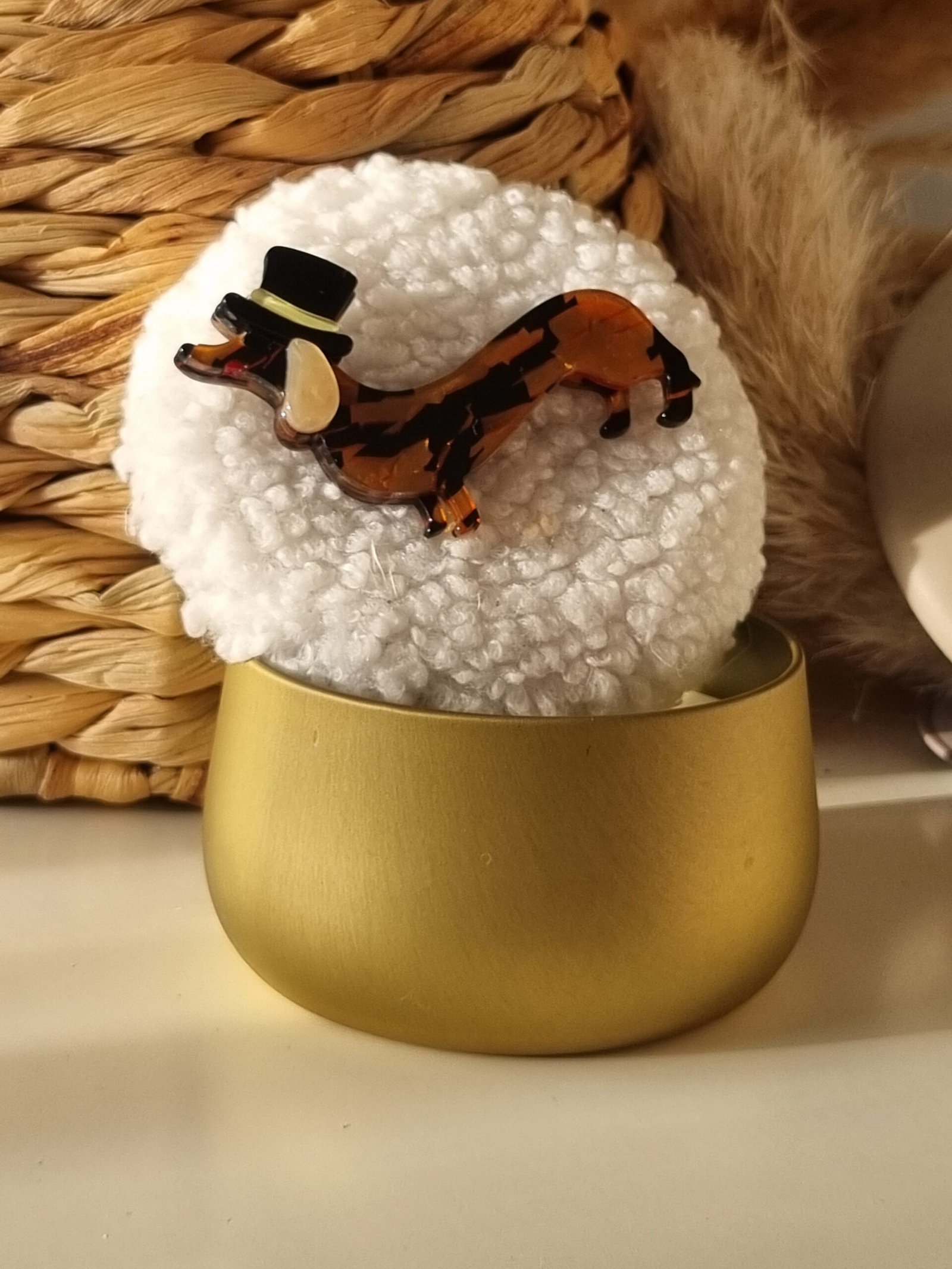 Le détail unique des Caprices d’Eliza ? Une broche bijou en forme de chien, soigneusement fixée sur le capuchon en tissu bouclette du contenant, que vous pouvez porter ou accrocher ailleurs, selon vos envies ! Cette broche fait de la bougie les caprices d’Eliza un cadeau unique et raffiné, alliant élégance et touche personnelle. Une fois la bougie consommée, le contenant du doré et la broche continuent d’embellir votre quotidien, ajoutant charme et utilité pour un souvenir durable.